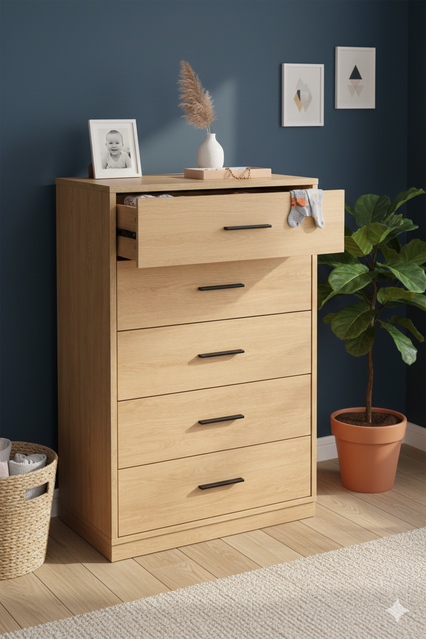 A modern wooden chest with five spacious drawers, perfect for organizing clothes and essentials. Designed with a clean, minimal look that fits any bedroom or living space.
