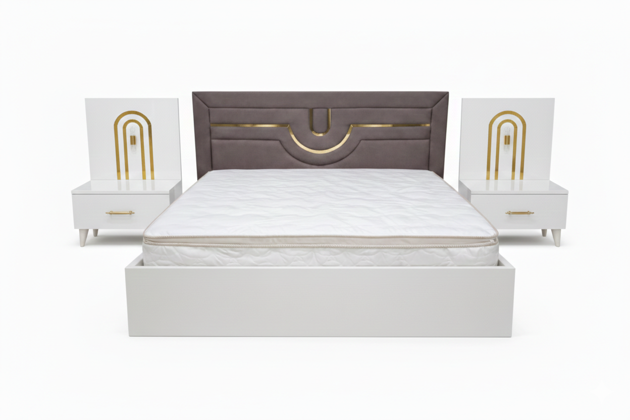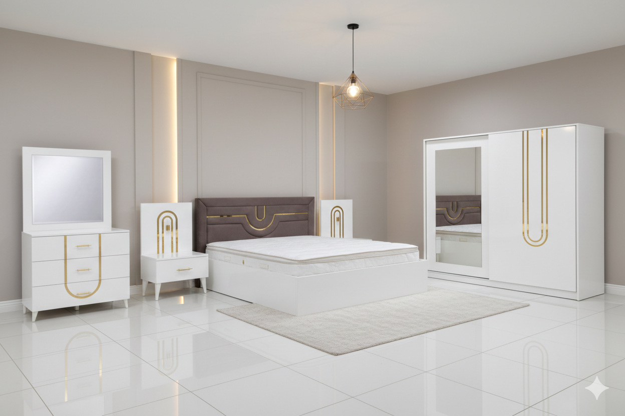 Experience timeless elegance with the Turkish Bedroom Set – M8 (White & Gold). Designed with soft neutral tones and refined gold accents, this bedroom set brings a luxurious yet calm atmosphere to your space — perfect for modern homes that value style and comfort.