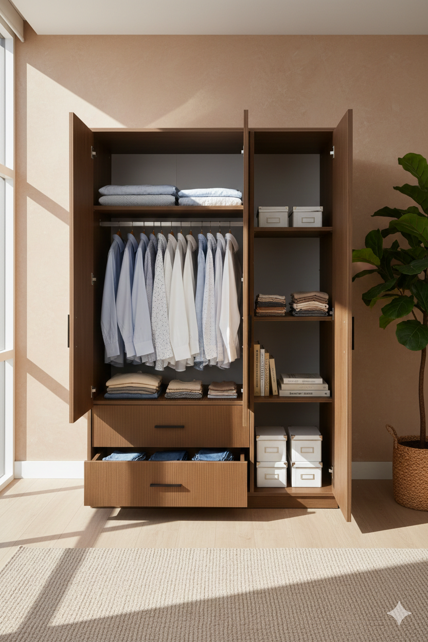 Modern wooden wardrobe featuring hanging space, side shelves, and two bottom drawers. Ideal for bedrooms and compact spaces.